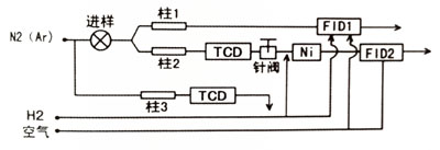 樣品氣通過一路載氣進入FID1檢測器檢測出烴類氣體,通過另一路載氣先進入TCD檢測器檢測H2、O2;然后經(jīng)鎳轉(zhuǎn)化爐,進入FID2檢測器檢測出CO、CO2,克服大量CO、CO2對烴類氣體,尤其是對C2H2的檢測干擾,大大提高了烴類氣體的檢測靈敏度;