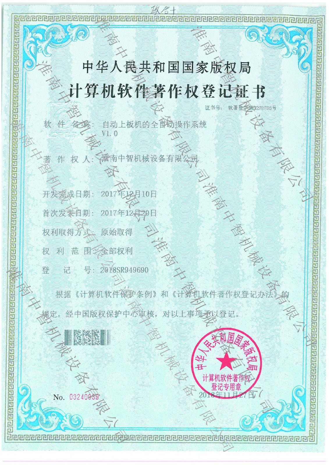 淮南中智機(jī)械自動(dòng)上板機(jī)全自動(dòng)操作系統(tǒng)專利證書