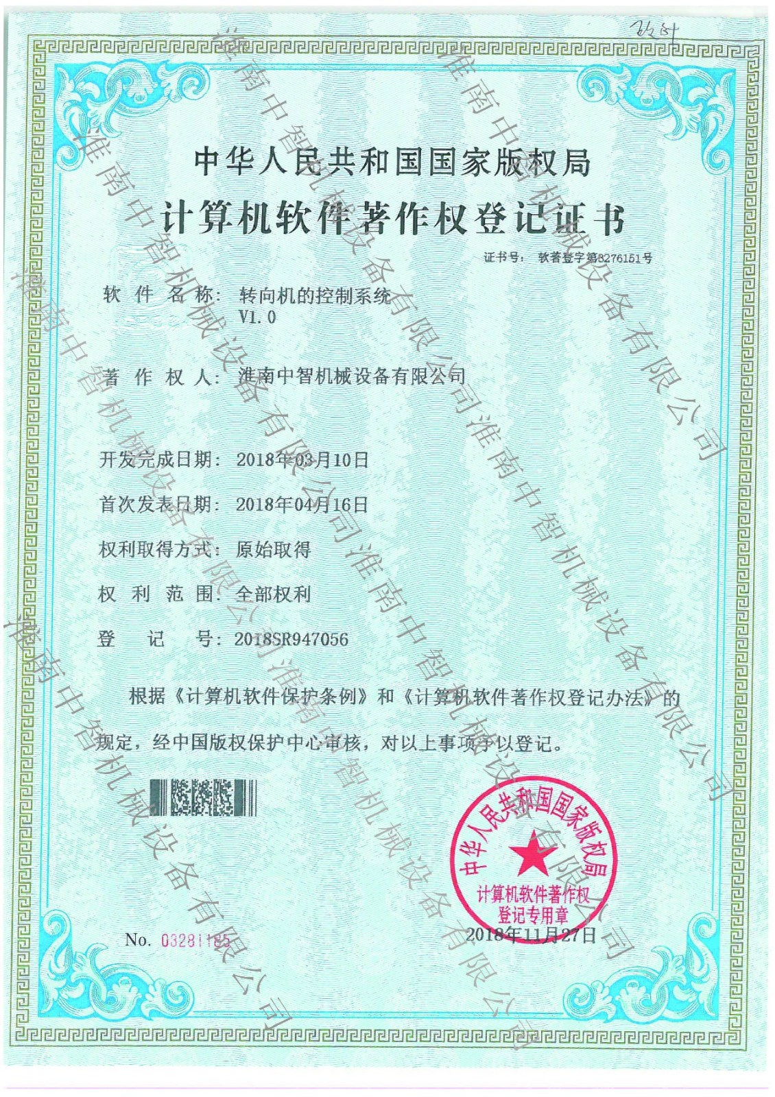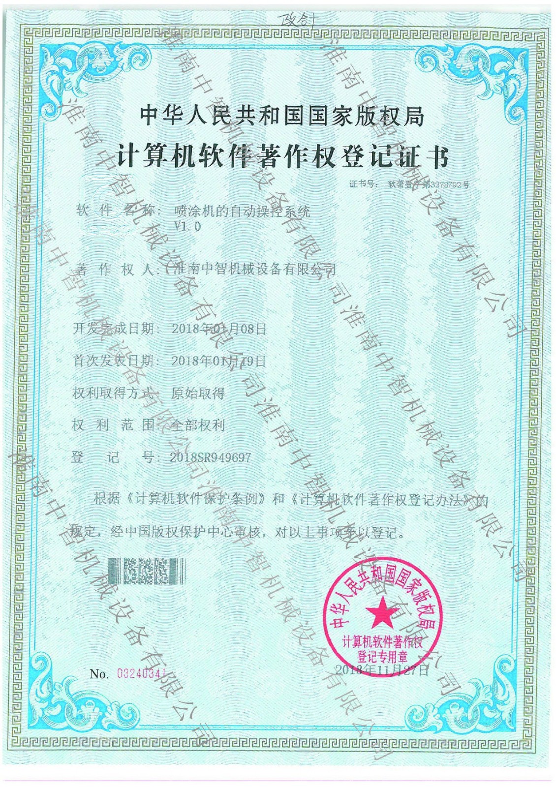 淮南中智機(jī)械噴涂機(jī)的自動(dòng)操控系統(tǒng)專利證書